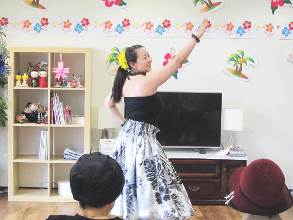 最後にハワイの挨拶で締めくくり。ダンサーの皆さんと入居者さん全員で親指と小指を立てるポーズをして、一斉に「アロハ~!」